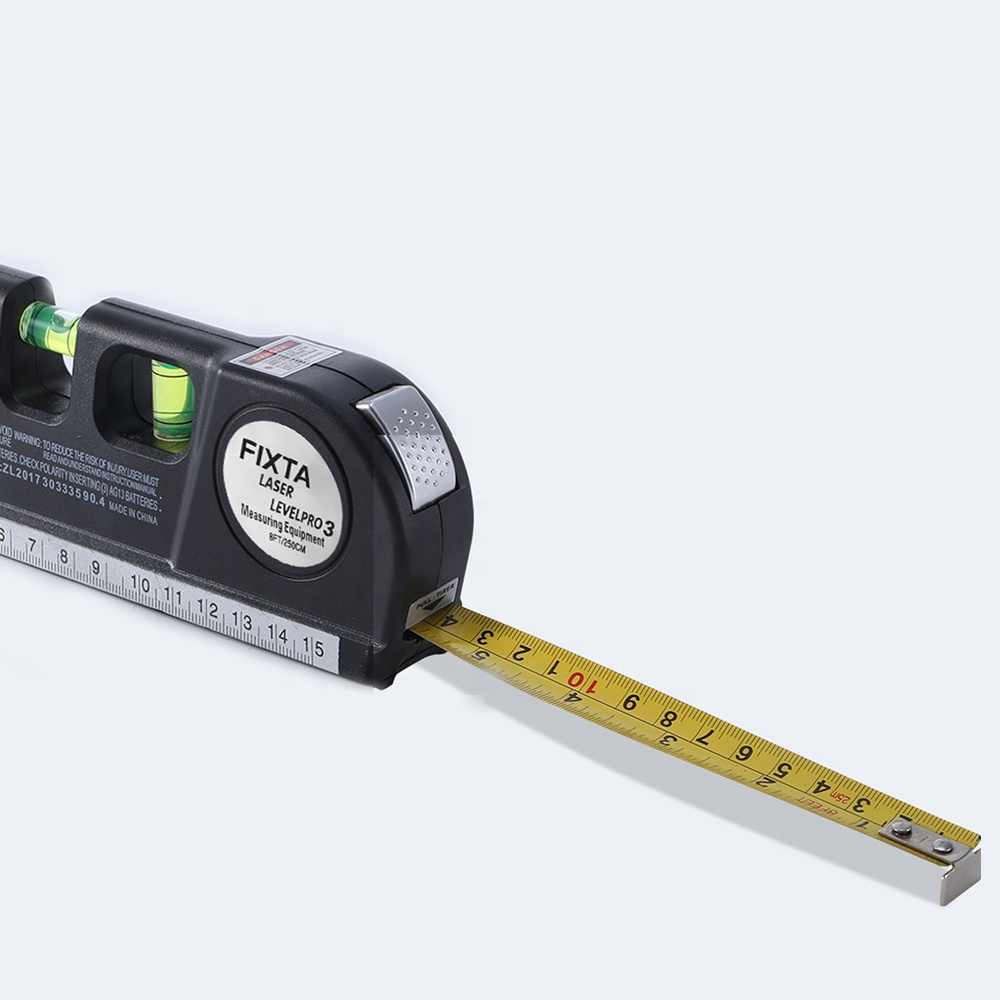 It combines a tape measure, a triple-positioned leveling bubble and a laser level into one tool. Designed for any situation where a straight line or accurate measurements are needed.